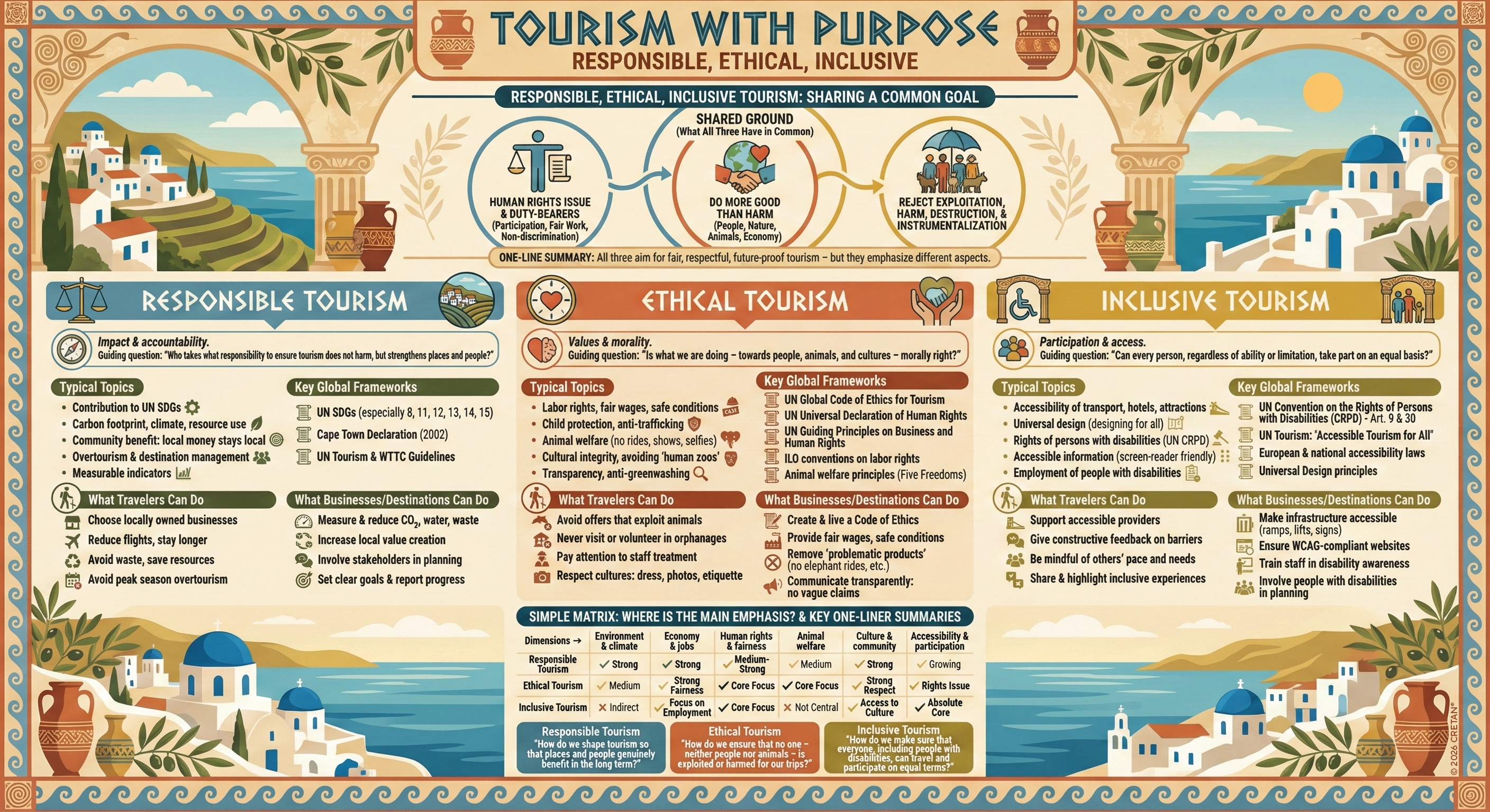Responsible, ethical, and inclusive tourism share common ground while emphasizing different priorities. Together, they form a comprehensive vision for travel that benefits everyone.