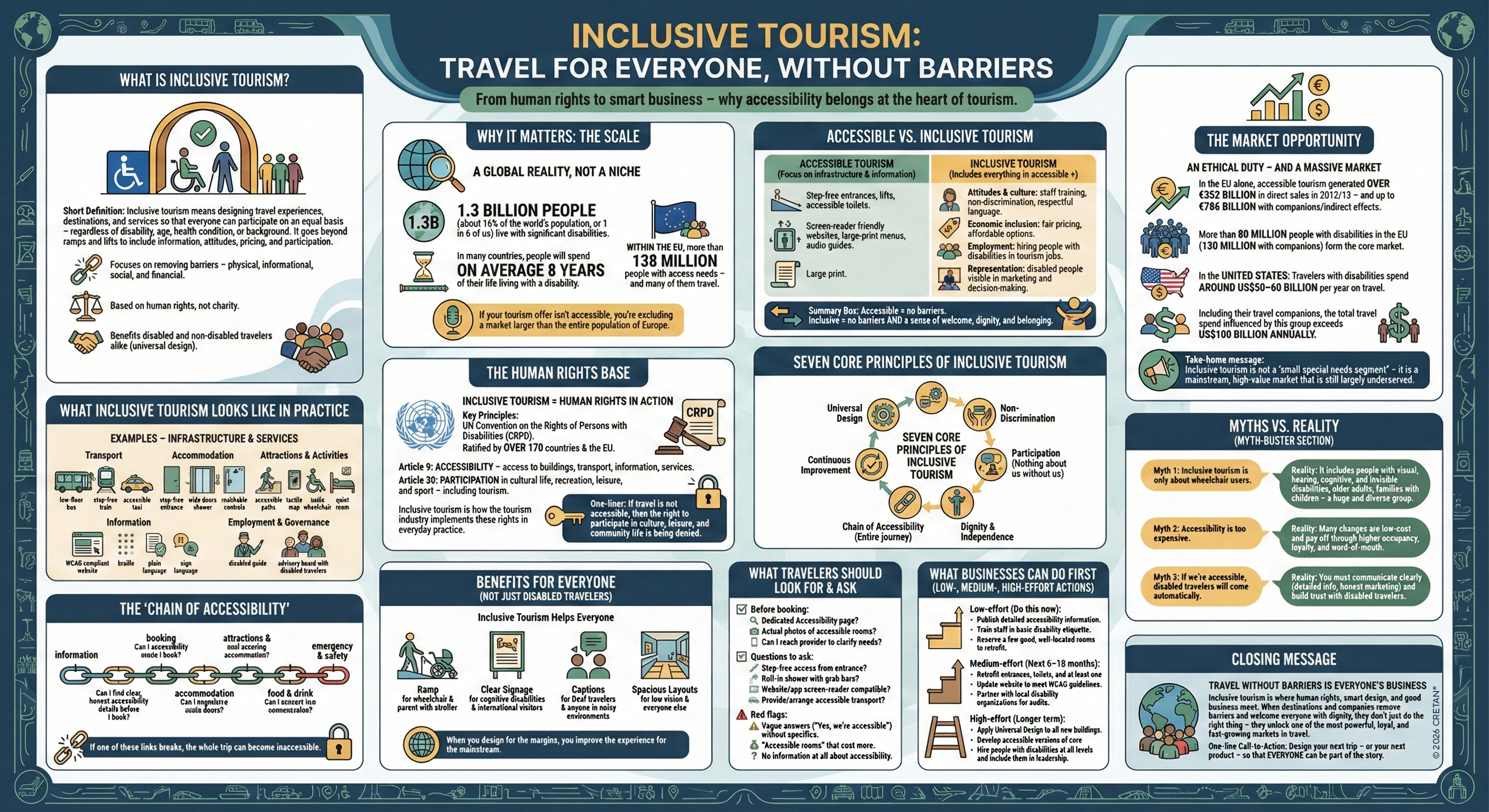 The moral case is simple: travel is a human right. The CRPD, the Universal Declaration of Human Rights (Article 24: right to rest and leisure), and regional human rights frameworks all affirm that people with disabilities have the same right to explore the world as anyone else. Excluding them is not just bad business — it's a human rights violation.